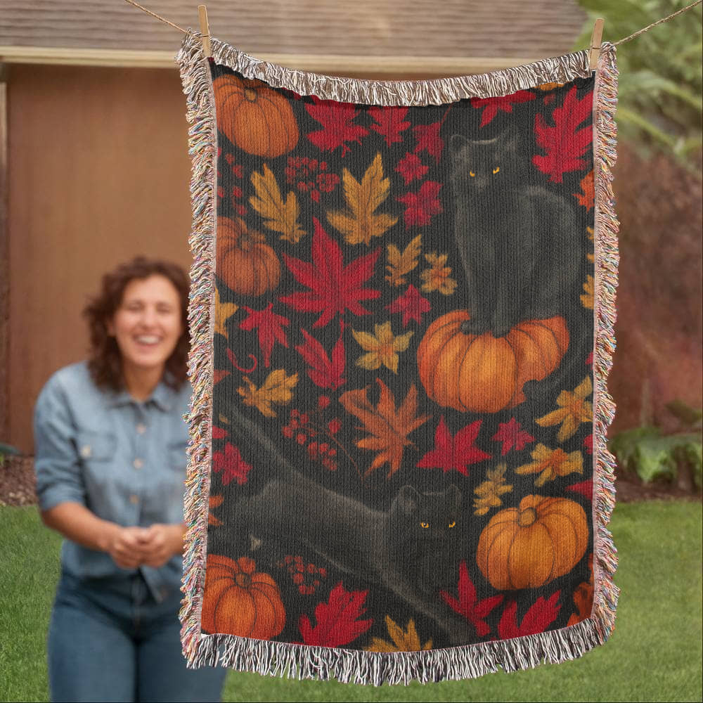 Imagine your home wrapped in warmth. This throw blanket adds a touch of charm with its black cat and autumn leaf design, making any room feel inviting and stylish.